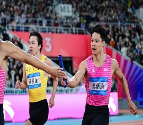 这场告别演出,苏炳添担任第一棒。枪响、起跑、过弯、冲刺……一切似乎都朝着完美的谢幕剧本发展,直到苏炳添和刘洪熙的交接出现了失误,广东队失去优势,即便最后一棒的陈冠锋拼尽全力,广东队依旧以0.03秒的劣势屈居第四。