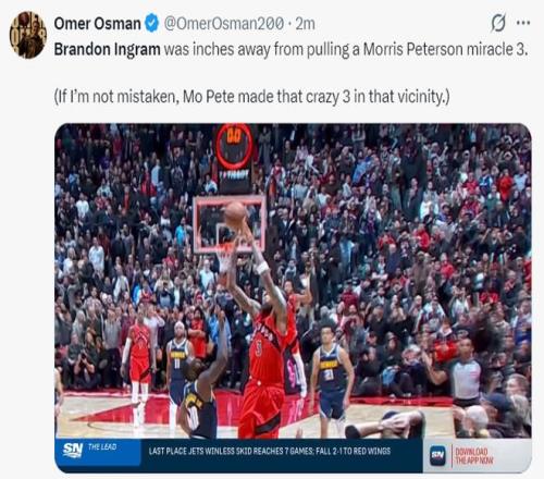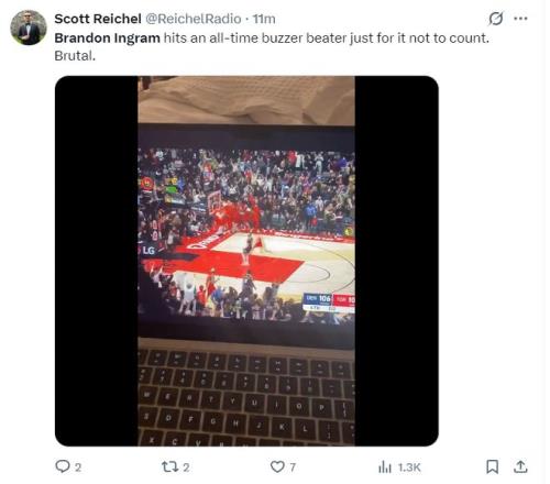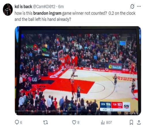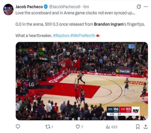 这场比赛最大的争议就是第四节结束前英格拉姆的绝平三分,布鲁斯-布朗的第二罚没中,猛龙疯狂反击冲到前场,英格拉姆漂移三分球命中,可裁判随后判定这个三分绝平超时。