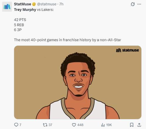 在这个消息出炉后,墨菲在对阵湖人的比赛中就大放异彩,全场比赛39分钟,26中14,三分17中6,罚球9中8,拿到42分5篮板3助攻,命中率53.8%,三分命中率35.3%,他的个人表现比东契奇还要出色。